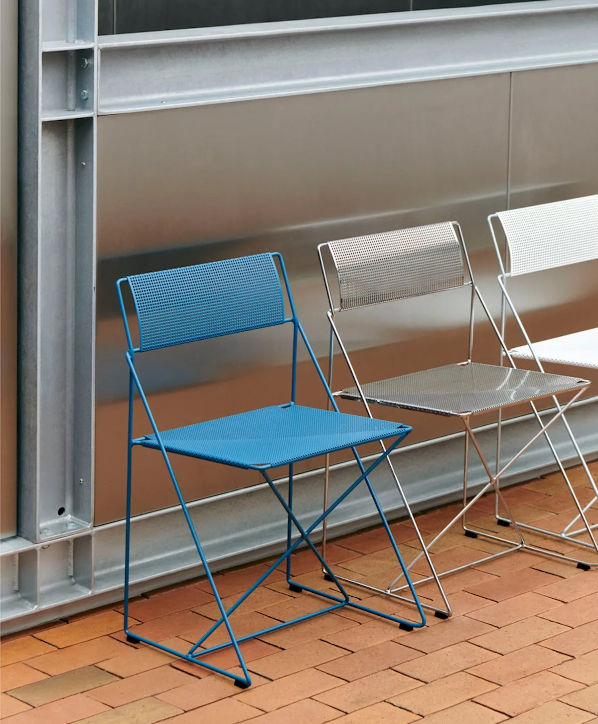 The Danish designer behind the chair Niel Jørgen Haugesen, who worked with Arne Jacobsen in the 60s, was able to embrace this new engineering-based, inside-out approach to design. His carefully thought-out chair offers optimal functionality, with the refined design process resulting in the distinctive X-structure that makes it strong, lightweight, and flexible. “What I love about high-tech design and architecture is its transparency,” says Hay. “It was okay to show everything. It’s a very minimal and transparent chair and it’s showing how it is constructed.”