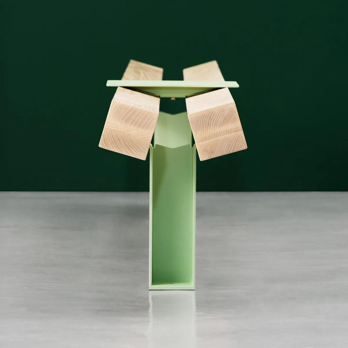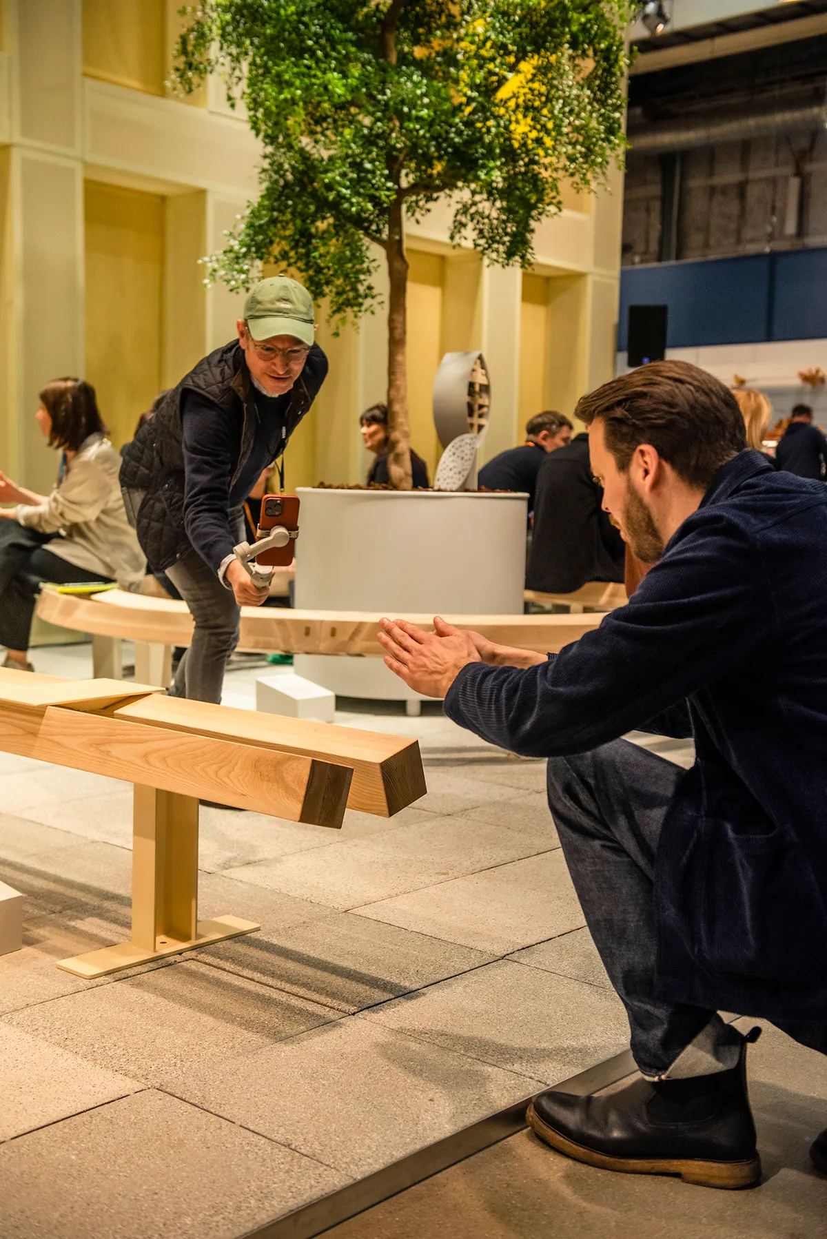 ”The contrasts between the materials are also interesting, both between the steel and the glulam and in the space between the beams of the seat. The bench is also proof of how much you can do with steel. Nothing in the main element of the base is welded, instead, the steel evokes folded paper. It highlights the quality of both steel and wood. I like form-wise innovation where you can work with traditional materials and still create something new”, says Rybakken.