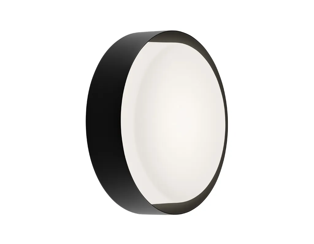 With its graphically clear shape, opaque acrylic shade and black-painted steel, CAP could be regarded as an easy-to-use tool. Keywords during the design phase: function, production and maintenance. The result is a practicable element for large and small civic-building projects, for outdoor and indoor use, on walls and ceilings, frontages, underpasses and stairwells. D 350 mm, height/depht 80 mm. LED or compact fluorescent 26-42W.