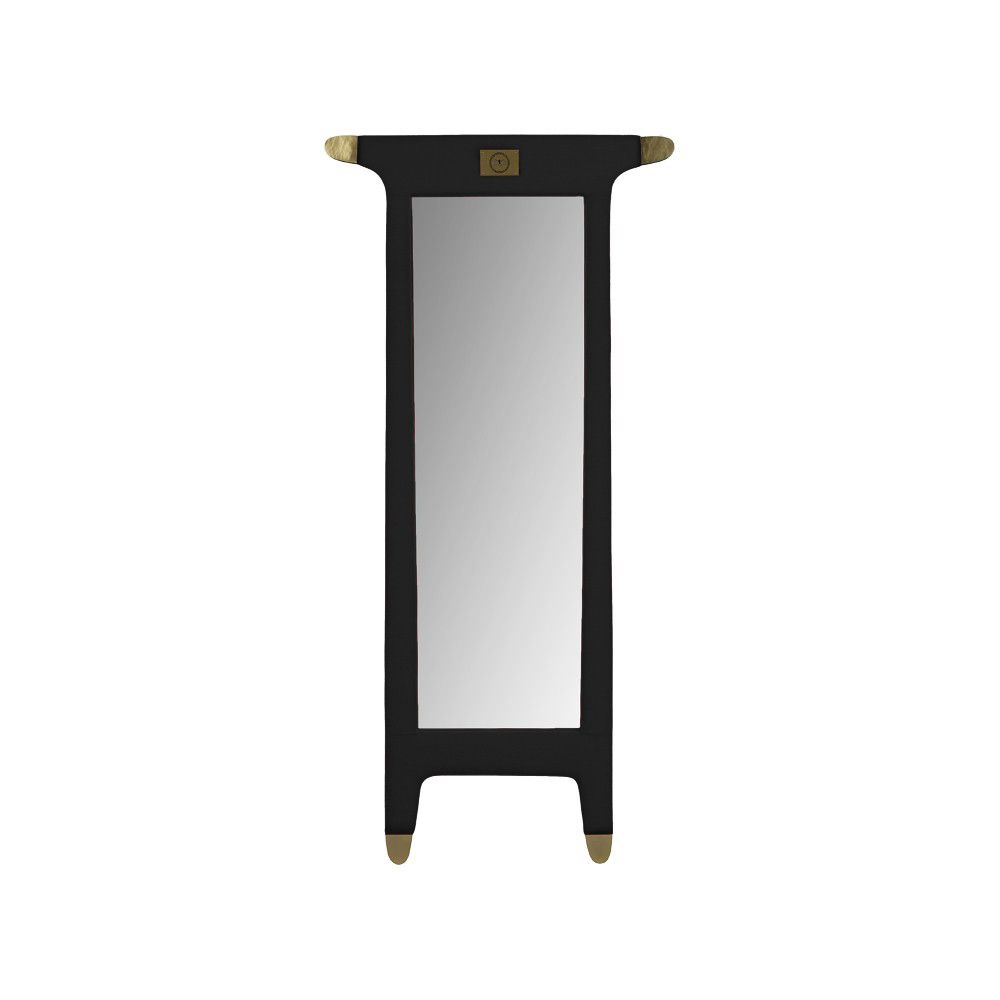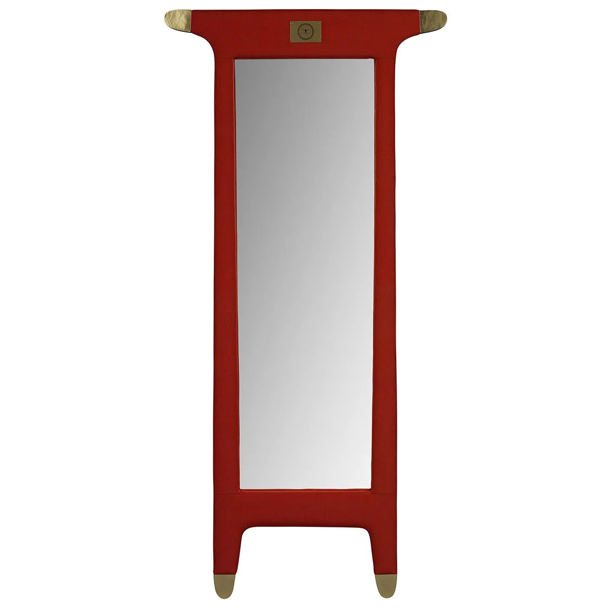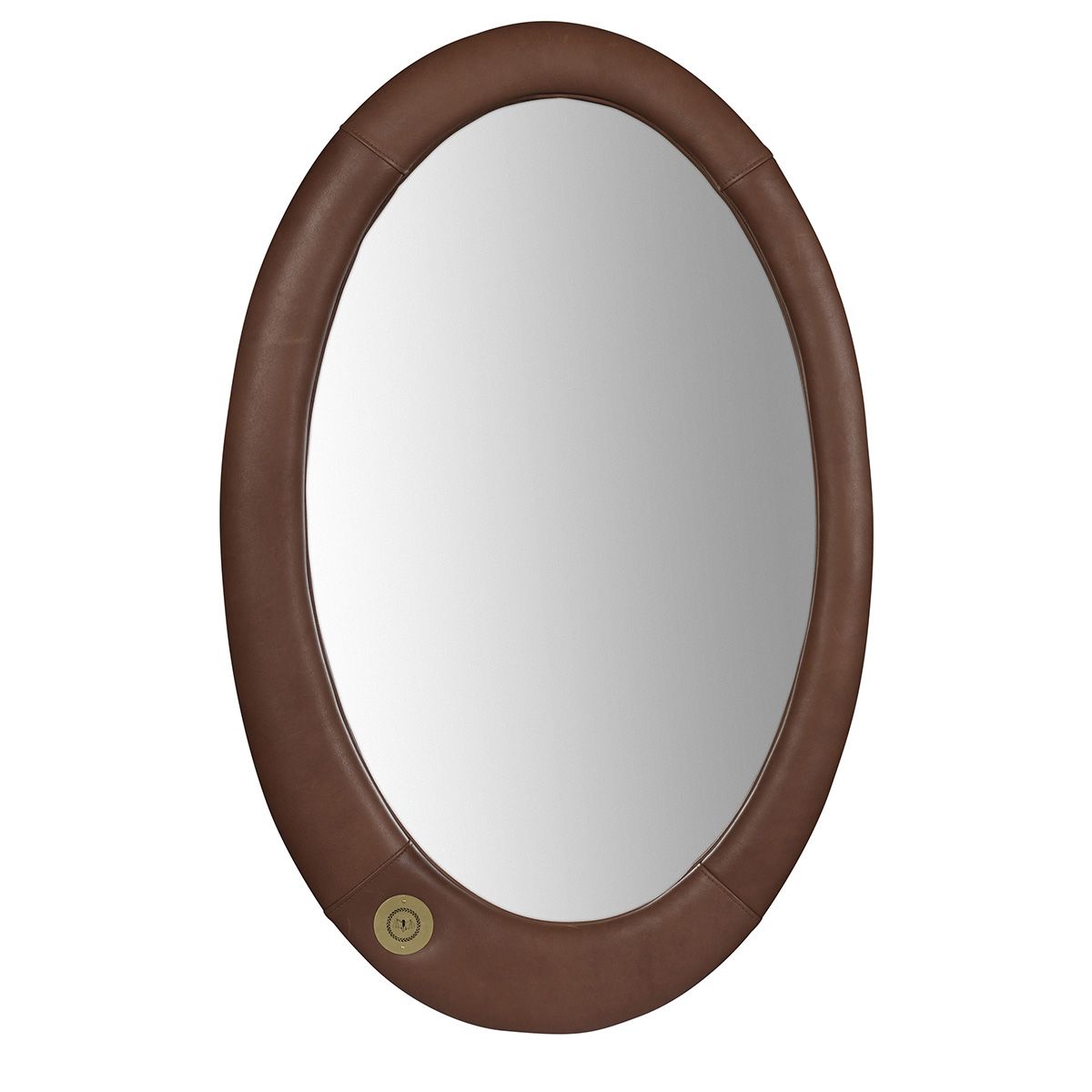 Mirror, frame upholstered in fabric or leather, silver soldered brass endings, brassplat. H. 184, w …