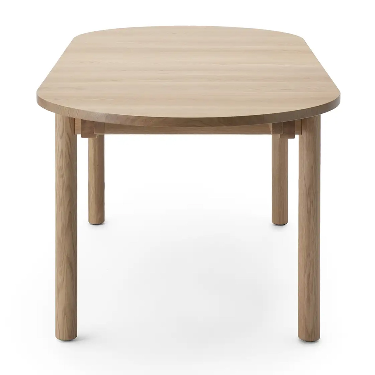 The oval table includes one extension piece, which can be stored inside the table. The extension mechanism does not affect the table’s appearance but is entirely hidden within the original profile of the Basic table.